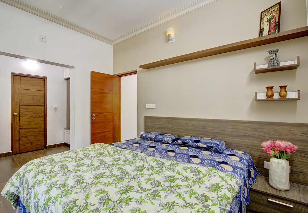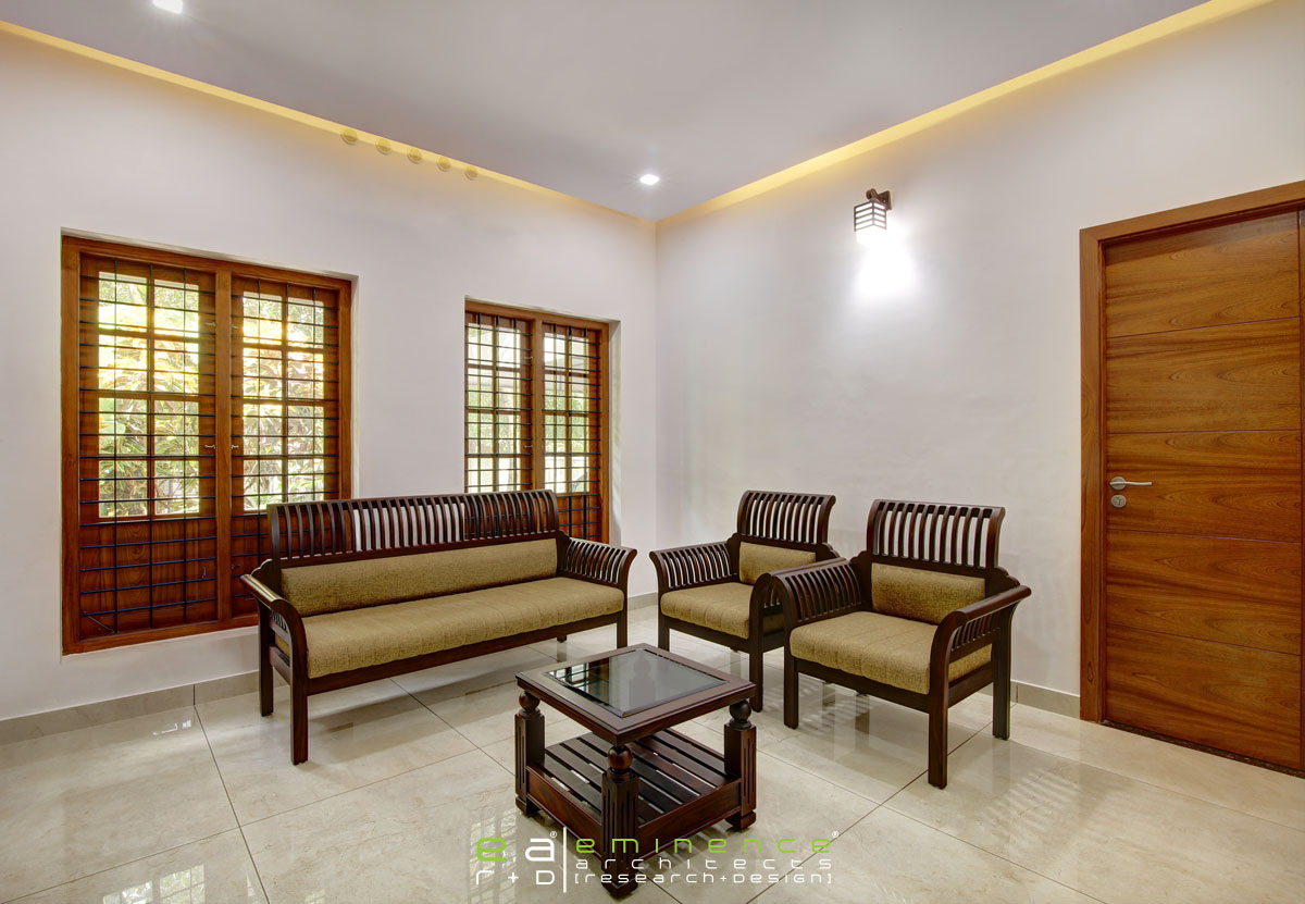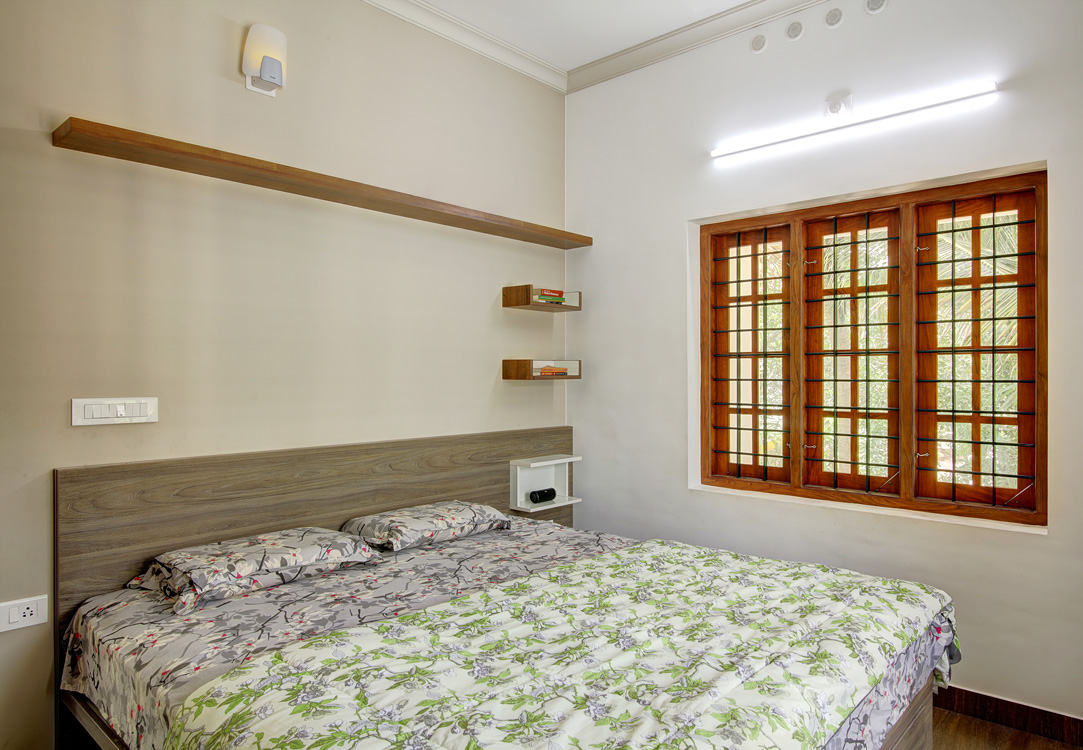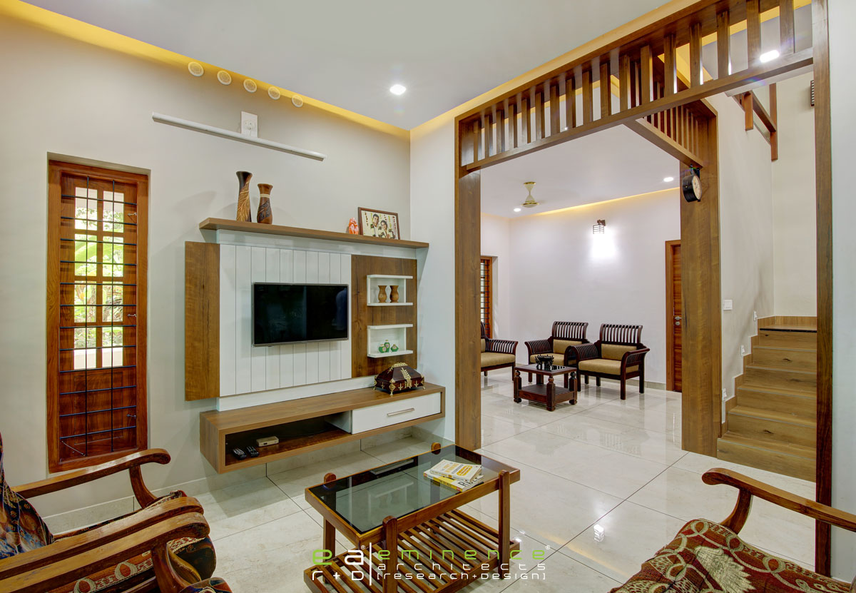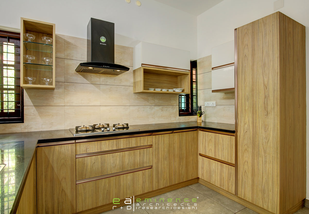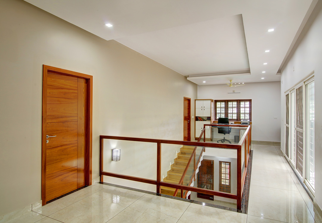 The material and colour palette of wood, white and beige was used throughout the project. The common spaces with beige glossy finish tiles, the bedrooms with wooden finish tiles and the kitchen with beige matt finish tiles differentiate the spaces. A single shade of wood and white was used for the architrave, TV unit, the under stair storage, wash counter, the pooja unit and the office space. A similar shade of wooden finish floor tile with granite beading was used for the staircase. Wood finished glass handrails are provided for the staircase and the passage above. The kitchen and the bedrooms interior units are finished with different shades of wooden laminates and white to differentiate with other spaces. The veneer finish internal doors along with the other interior elements make the space more bright and energetic.