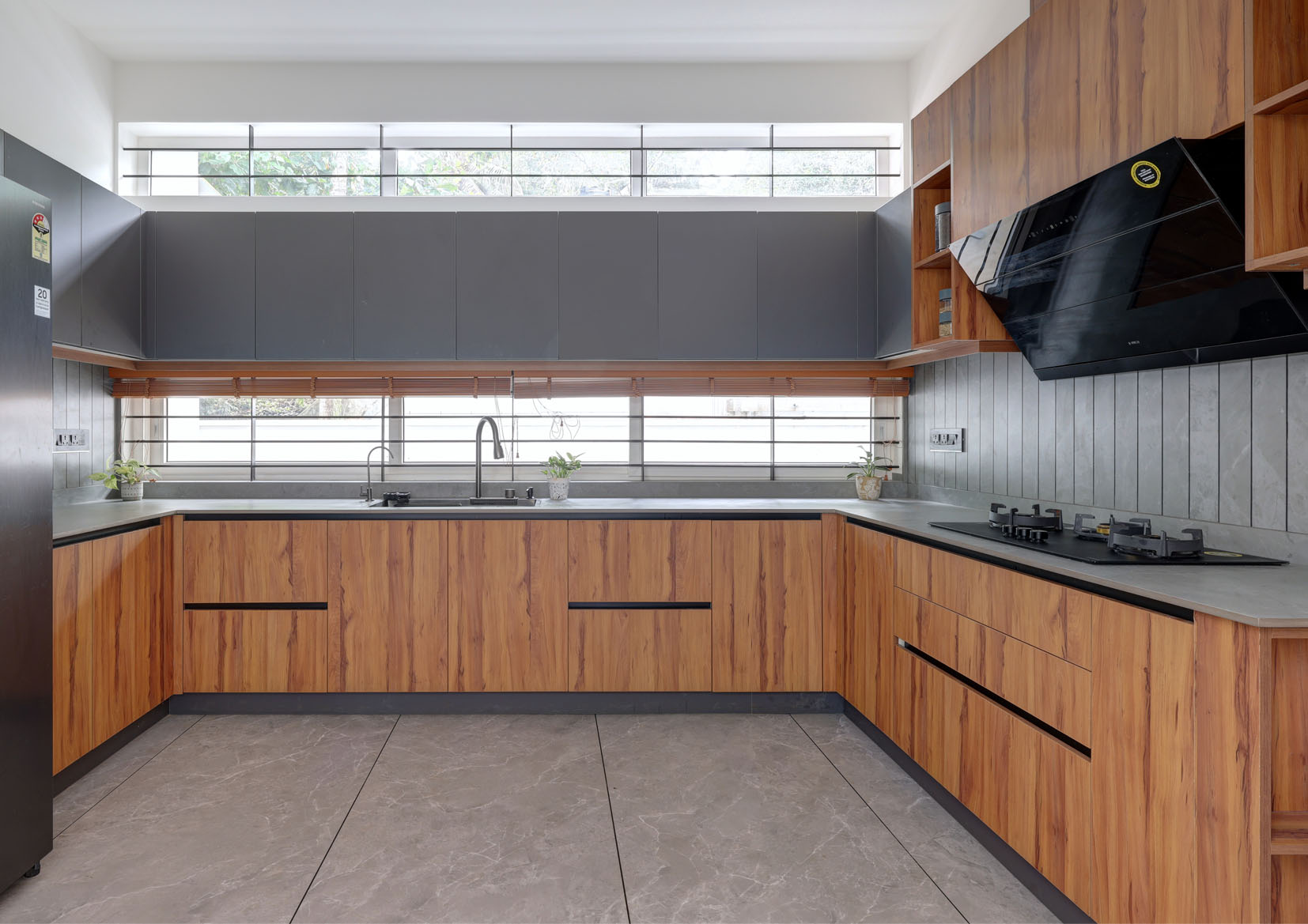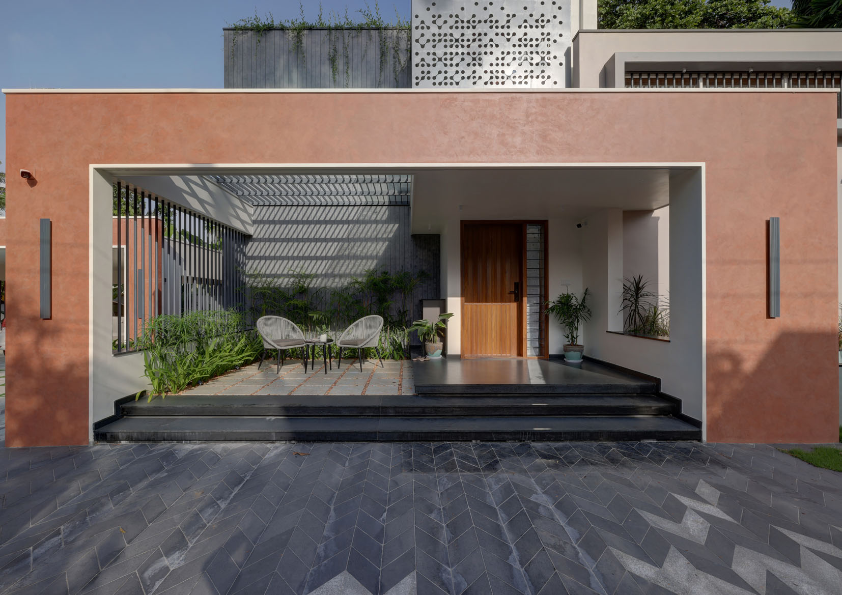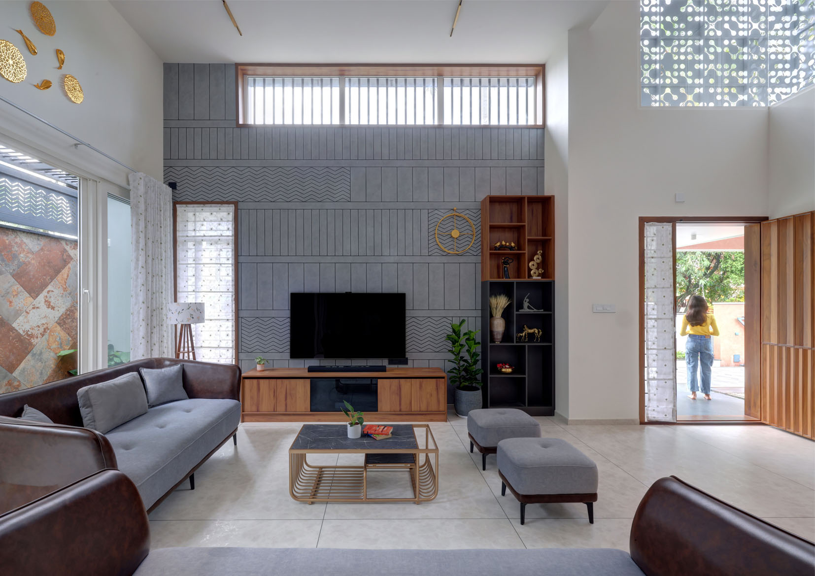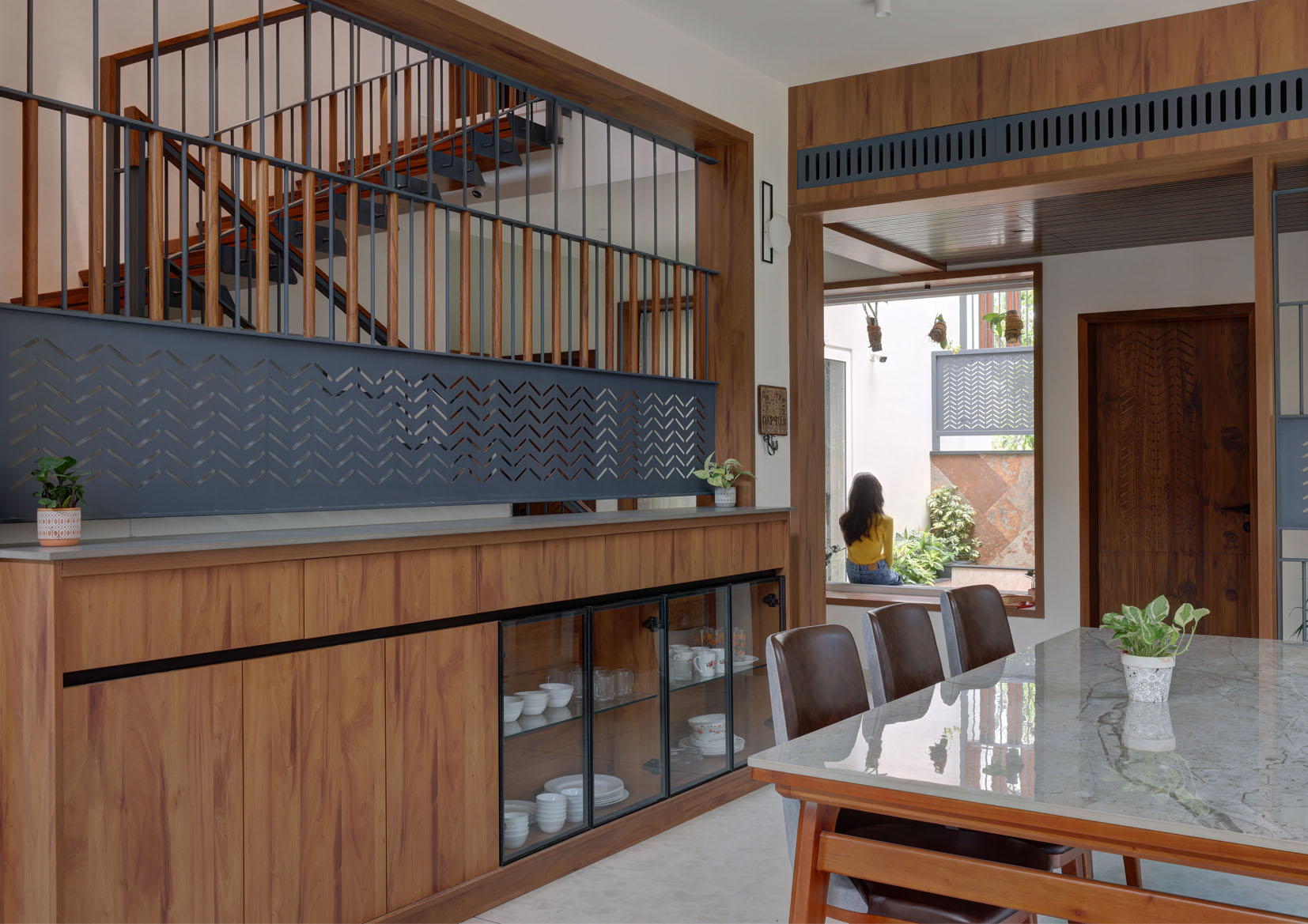 The careful placement of windows and courtyards ensures abundant natural light and ventilation, reducing reliance on artificial lighting and air conditioning. The minimalist exterior is paired with a warm, subdued interior palette, blending built-in and movable furniture in earthy tones to create a harmonious and functional living space.
