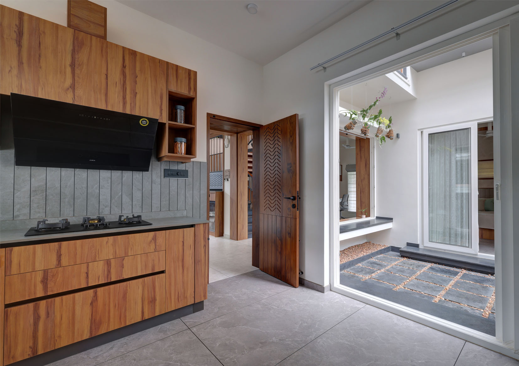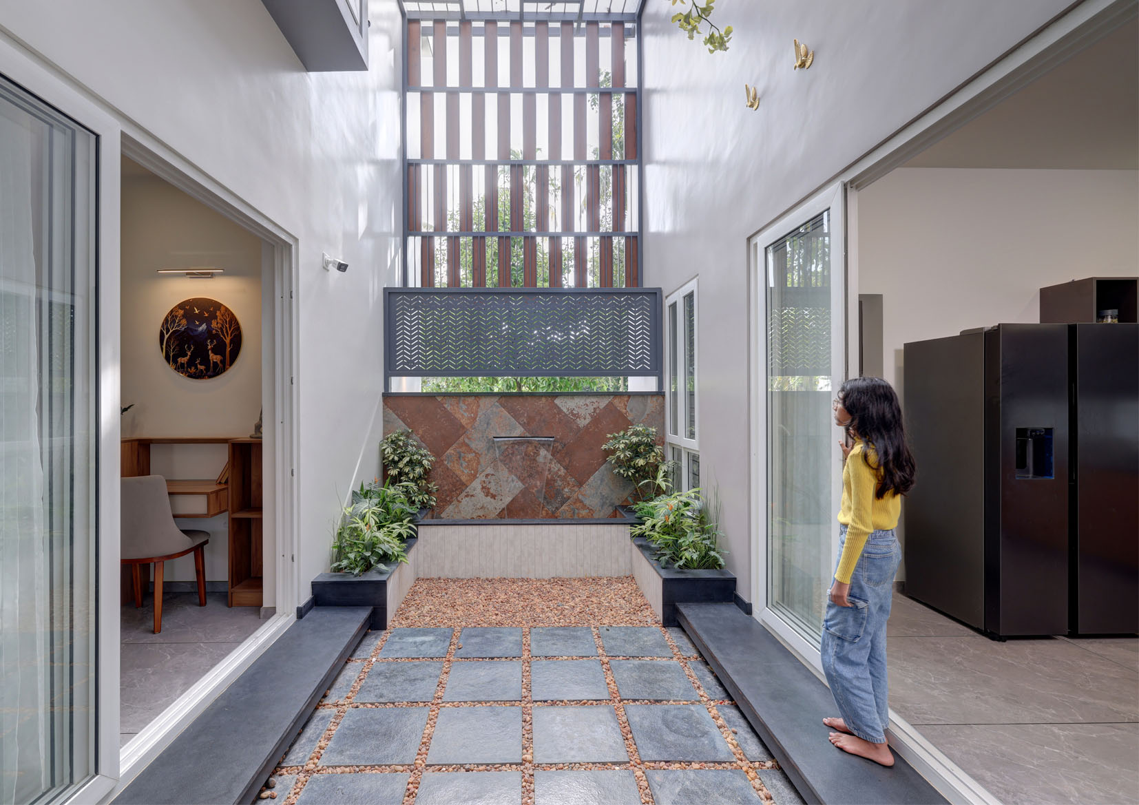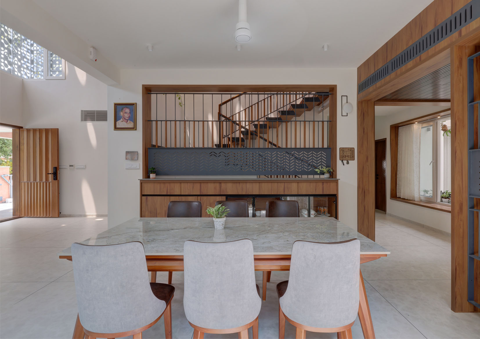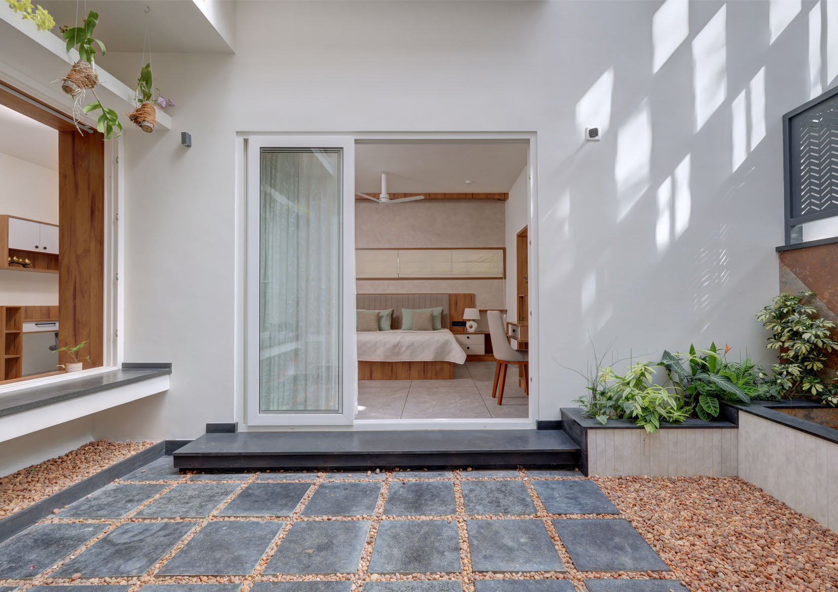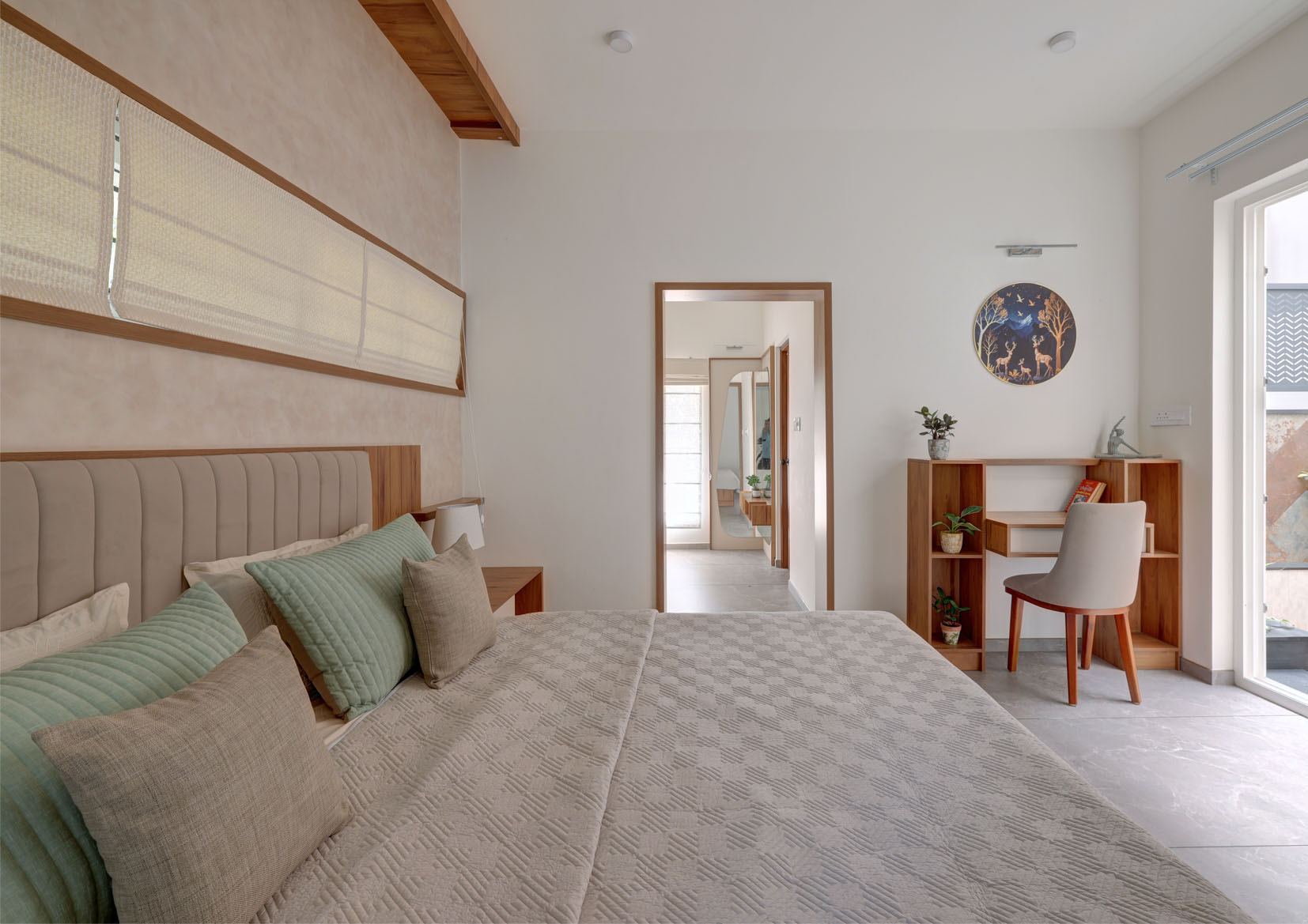 Behind the dining area, the kitchen connects seamlessly to a second, semi-open courtyard. This space links the kitchen to the master bedroom and ensures ample daylight and airflow throughout the home’s core. The southern wing contains two spacious bedrooms with attached bathrooms, connected by a study nook bathed in gentle natural light—perfect for quiet work or reading.