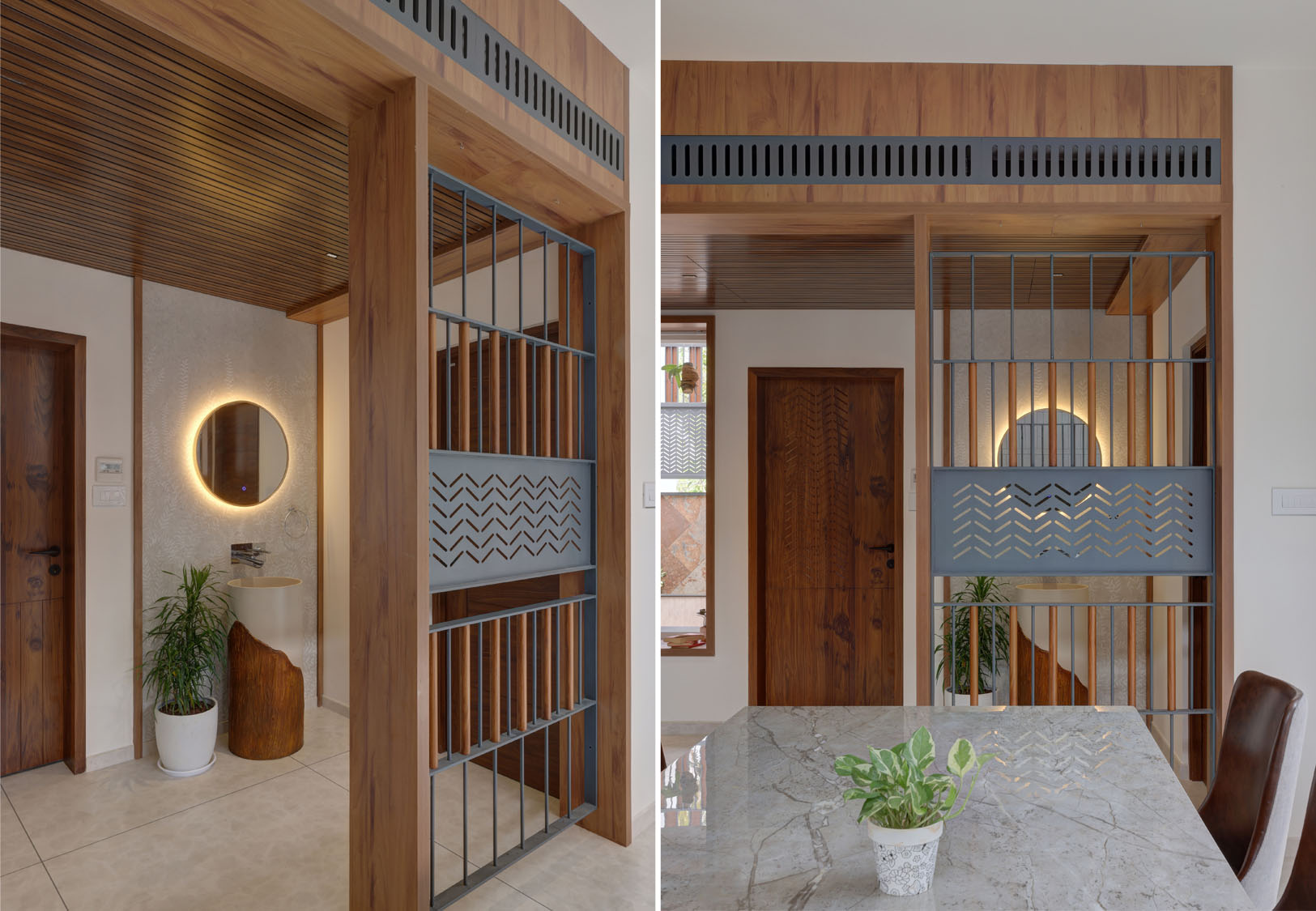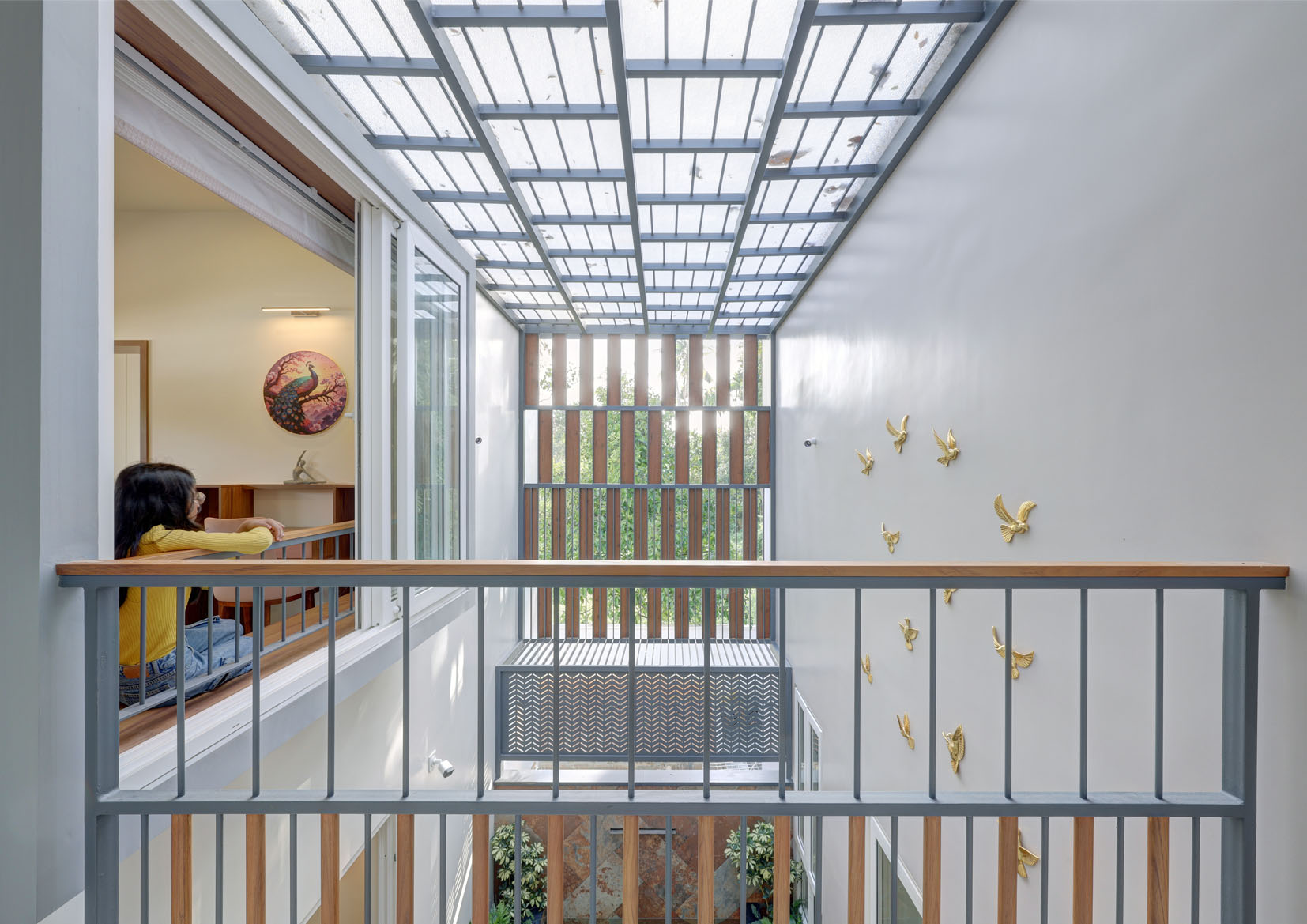 A staircase positioned behind the prayer wall ascends to the first floor, where terracotta clay pots and a circular skylight enhance thermal comfort and natural illumination in the foyer and stairwell. The upper level hosts a cozy family lounge, two additional bedrooms, and a balcony overlooking the courtyard, reinforcing a strong visual and spatial connection within the home.