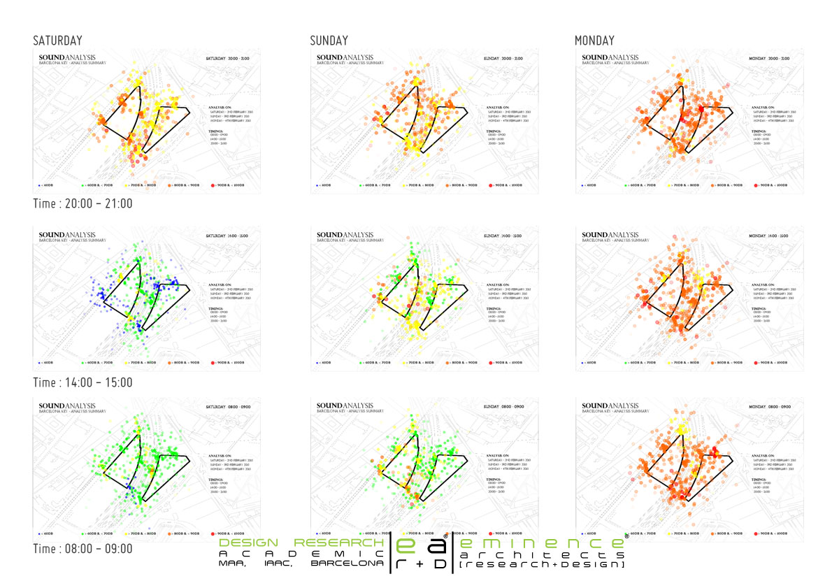 SOUND ANALYSIS: Sound was measured along different parts of the city and the site in order to compare the amount of sound produced during different time of the day. Based on the analysis the amount of sound inside the site was mapped.