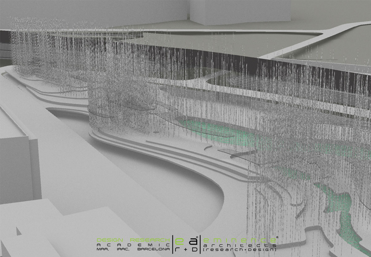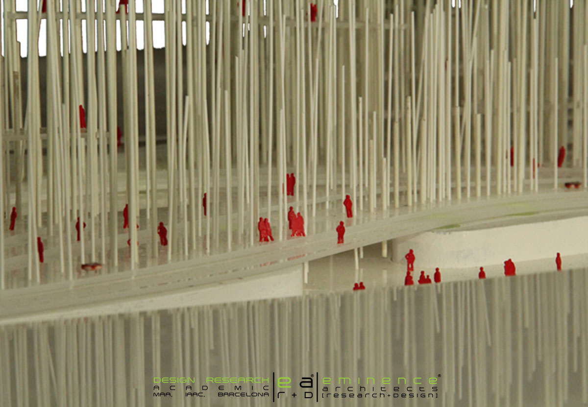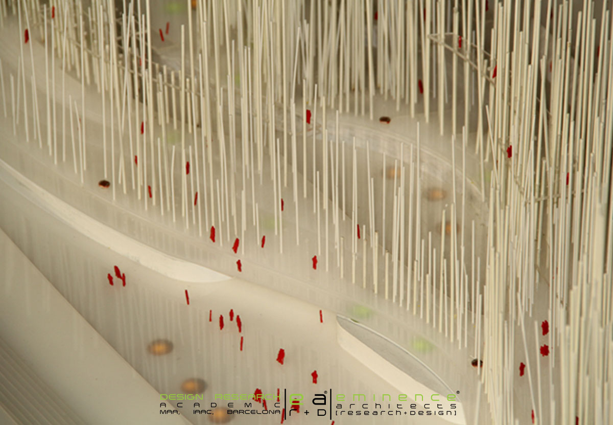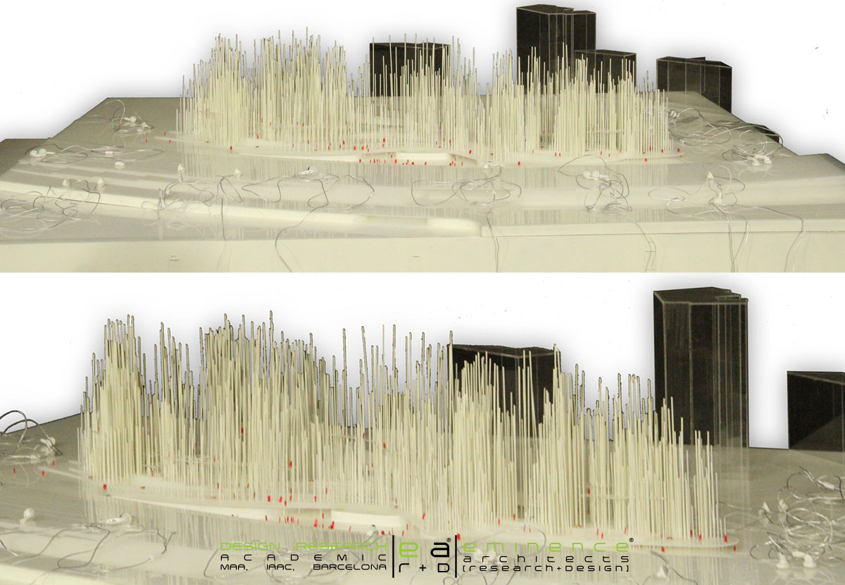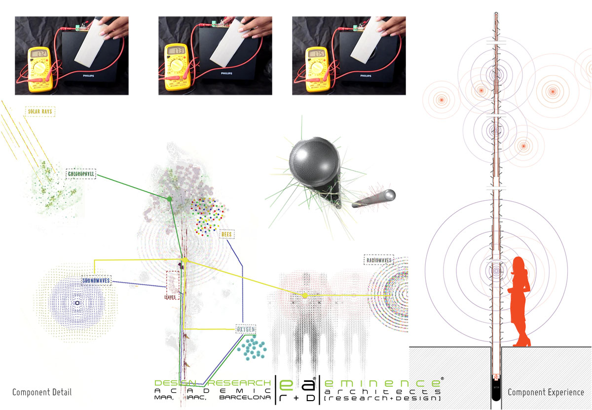 The component, vertical poles with the strips that can change their height as per the real time sound around the site in order to capture maximum sound vibrations into the strips and even to control the effect of external sound into the site. Every pole were made up of 4 poles of reducing diameters for allowing the pole t go inside one other to have a free vertical movement to react to the real time sound data.